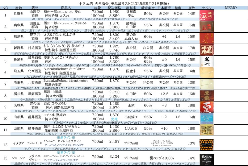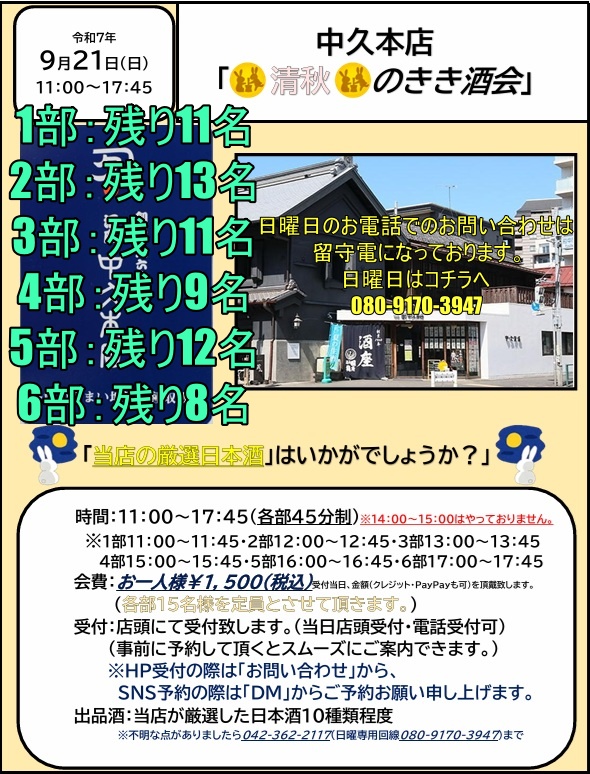明日9/21(日)は「中久本店 清秋のきき酒会」!