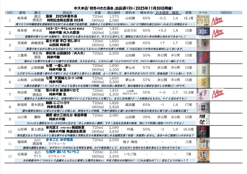 2025/11/30(日)「中久本店 初冬のきき酒会」開催のお知らせ