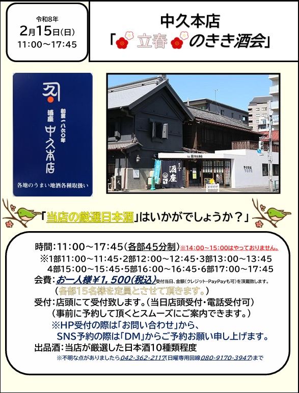 2026/2/15(日)「中久本店 立春のきき酒会」開催のお知らせ